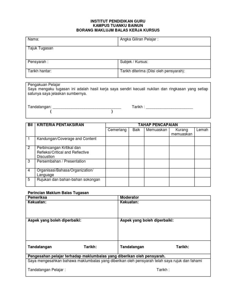 Doc Institut Pendidikan Guru Kampus Pulau Pinang Borang Maklum Balas Kerja Kursus Projek Amali Edup 3053 Academia Edu