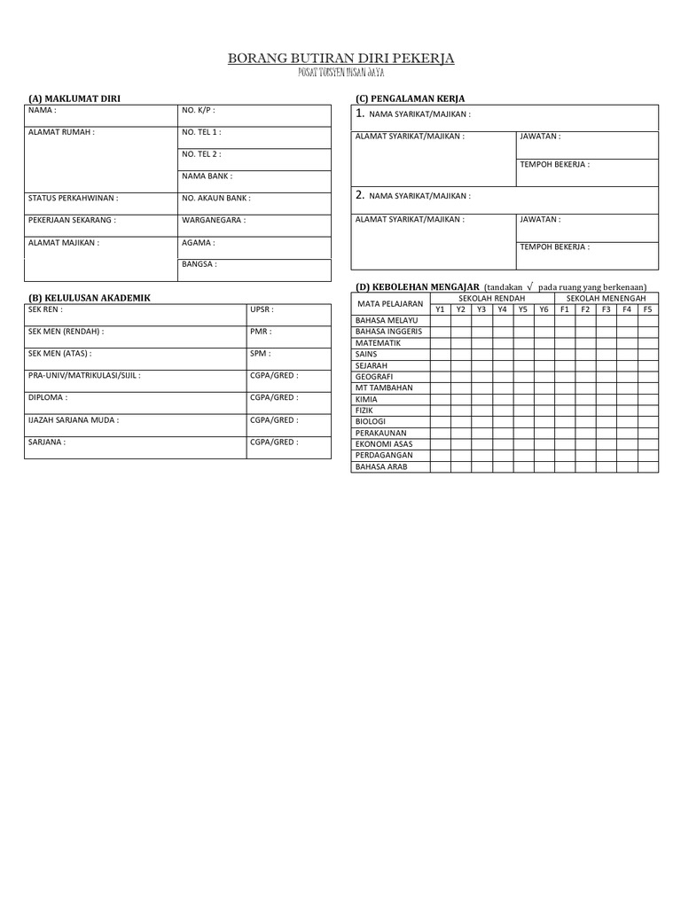 Contoh Borang Maklumat Pekerja