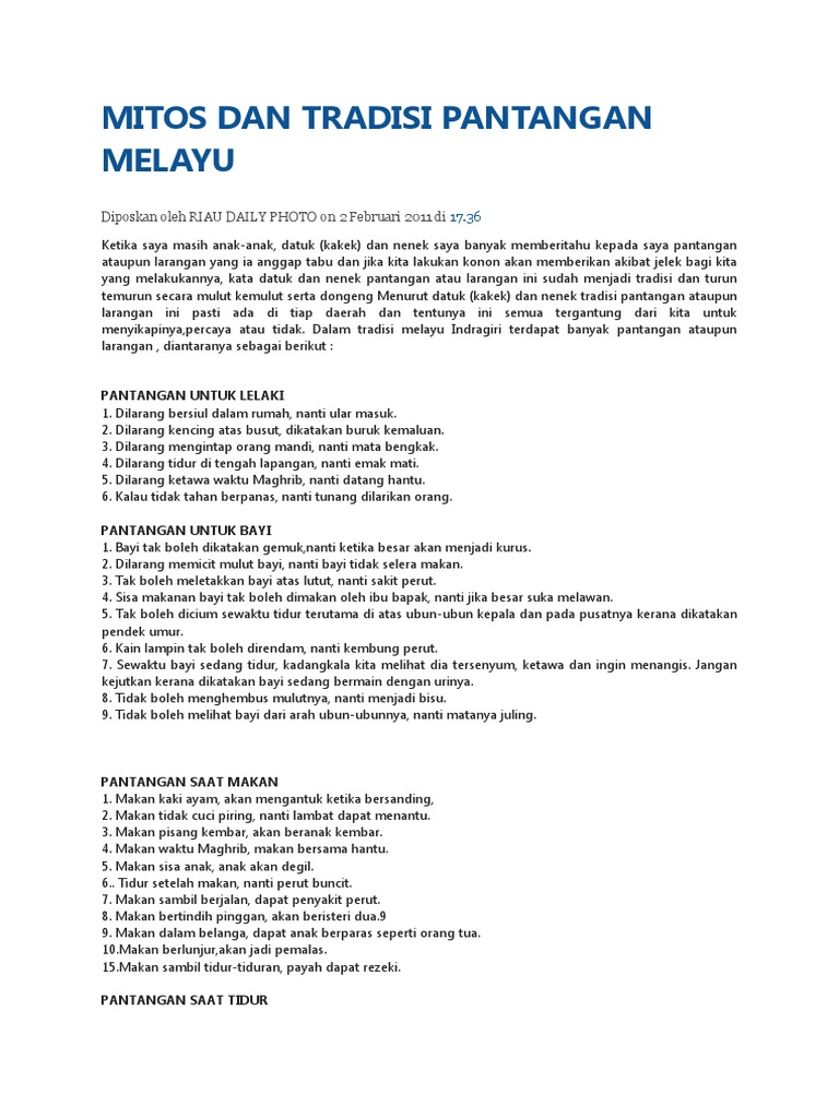 Masyarakat melayu memang kaya dengan adat resam dan pantang larangnya yang tersendiri. 1 pantang larang di dalam hutan 2 pantang larang kanak kanak 3 pantang larang di sungai 4 pantang larang ketika duduk 5 pantang larang ketika makan 6 pantang larang ke atas lelaki 7 pantang larang ke atas perempuan dengan demikian bahwa pantang larang yang telah dimunculkan oleh masyarakat melayu tidak terbatas pada satu aspek saja. Pantang larang orang melayu merupakan kepercayaan masyarakat melayu zaman lampau berkaitan dengan adat dan budaya warisan nenek moyang. Ada pantang larang yang masih kita ikut kerana mungkin terjadi secara kebetulan.