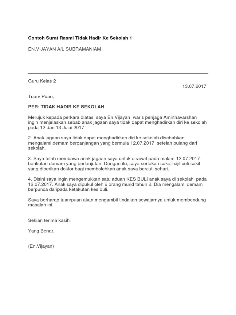 Contoh Surat Rasmi Tidak Hadir Ke Sekolah 1