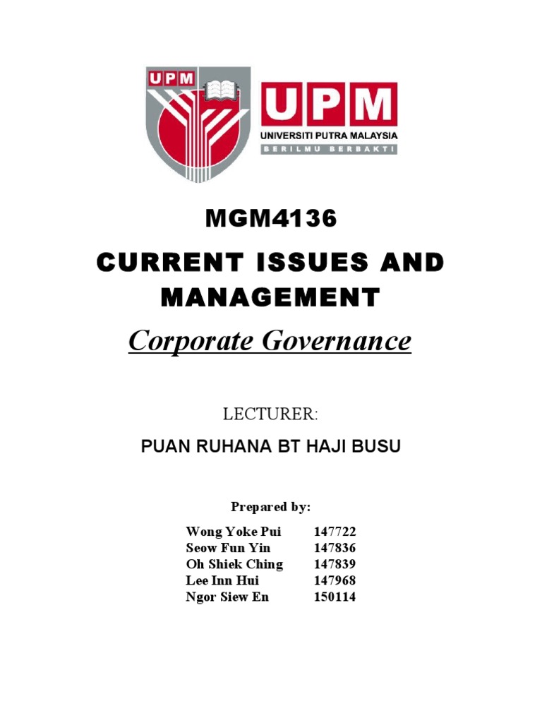 5 common issues that arise in corporate governance november 20 2016 by jane muir corporate governance is the term used to describe the balance among participants in the corporate structure who have an interest in the way in which the corporation is run such as executive staff shareholders and members of the community. Corporate governance cg may sound worrying to some small and medium enterprises smes as it is often associated with huge corporations compliance costs and a lot of reporting but it will do them more good than harm in the long run. The unit will explore current corporate governance issues in malaysia and selected asian developing countries and will involve a comparative study of how developed jurisdictions australia uk us and singapore have resolved these issues. The corporate governance strategic priorities 2017 2020 is the product of an extensive review by the sc on the state of corporate governance of public listed companies plcs in malaysia.