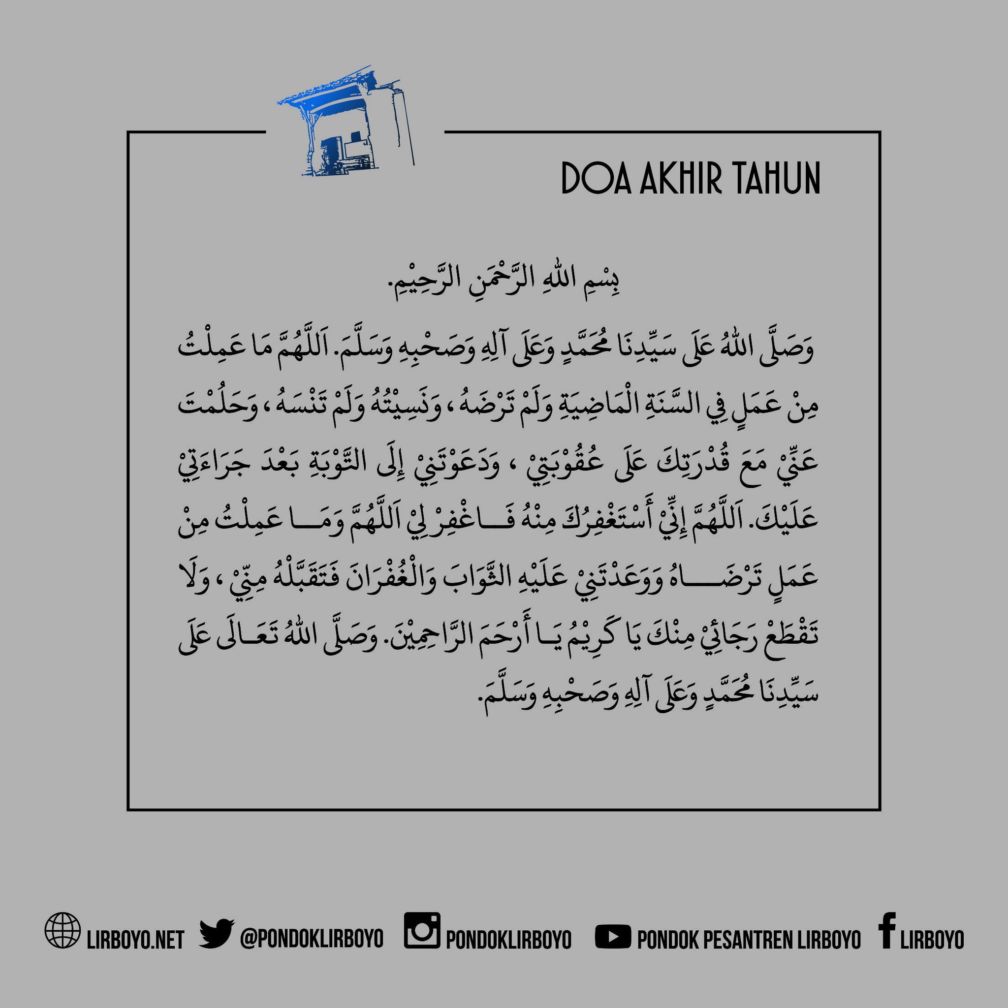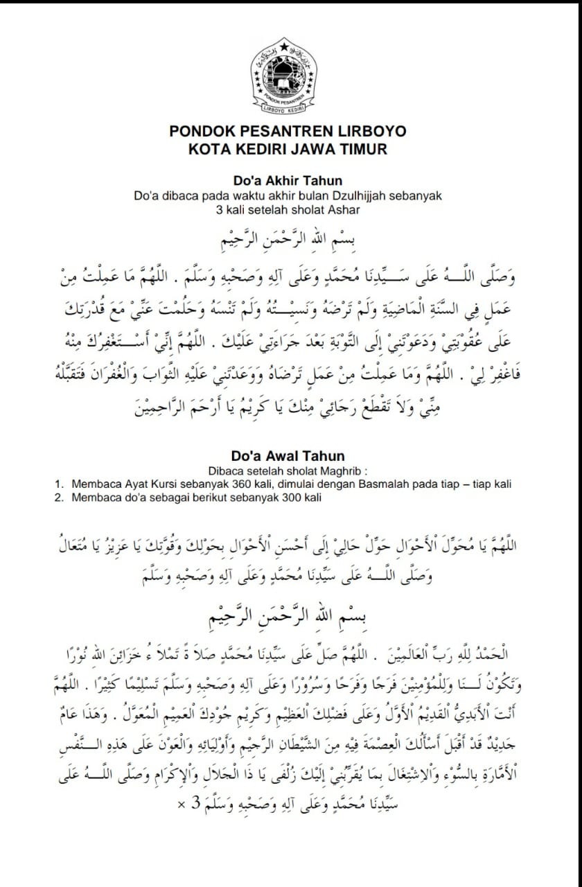 Doa awal tahun akhir tahun lirboyo. Pergantian tahun juga menjadi waktu yang tepat untuk memohon ampun atas kesalahan kesalahan kita yang telah lewat di tahun ini untuk kemudian minta perlindungan agar terhindar dari godaan setan di tahun mendatang. Sebelumnya sudah kita bahas tentang hukum doa awal tahun dan akhir tahun sejarah penanggalan hijriayah dan bacaan doa awal tahun dan akhir tahun. Tarikh maal hijrah tahun 2020 bersamaan dengan 1442h adalah pada hari khamis 20 ogos 2020 yang merupakan hari cuti umum sempena dengan kedatangan tahun baru islam 1442 hijrah atau awal muharram berikut dikongsikan bacaan doa akhir tahun dan awal tahun hijrah sebagai panduan buat umat islam. Dalam tahun hijriyah diawali pada tanggal 1 muharram dan diakhiri pada tanggal 29 atau 30 dzulhijjah.