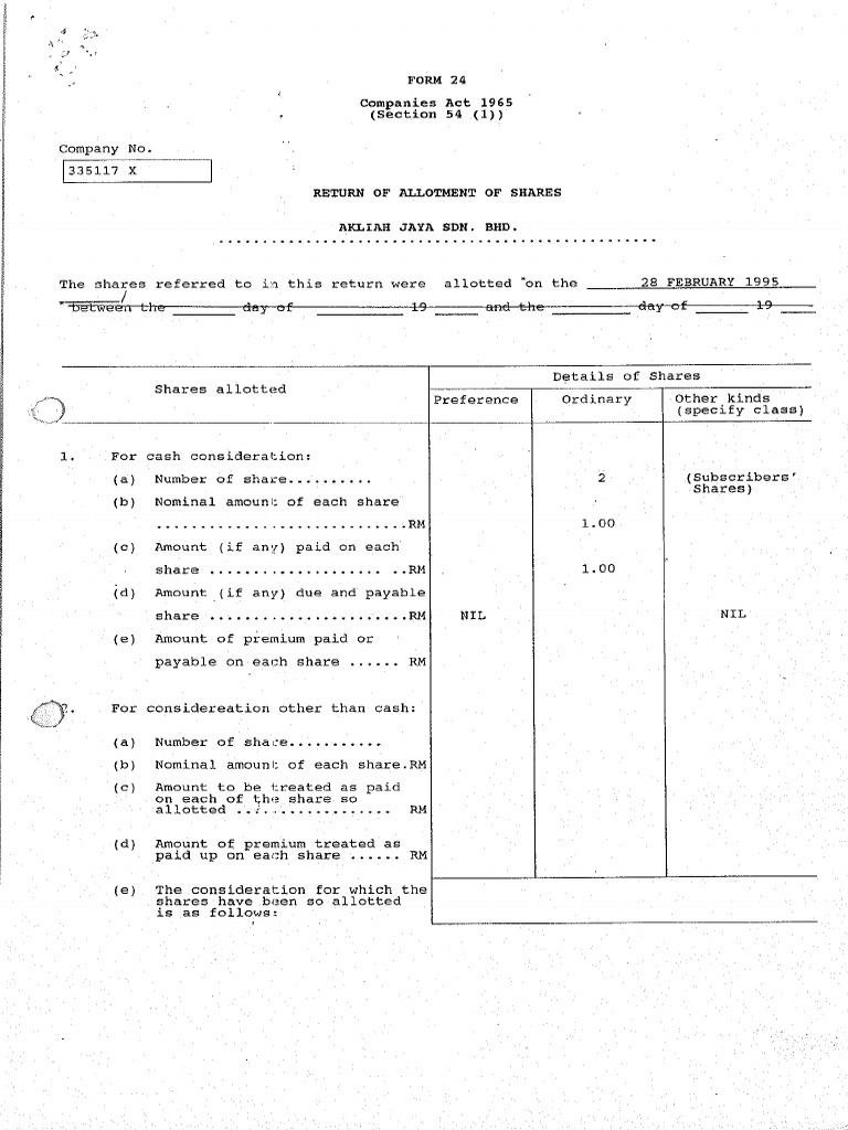 Form 24 Return Of Allotment Of Shares Company Registration In Malaysia