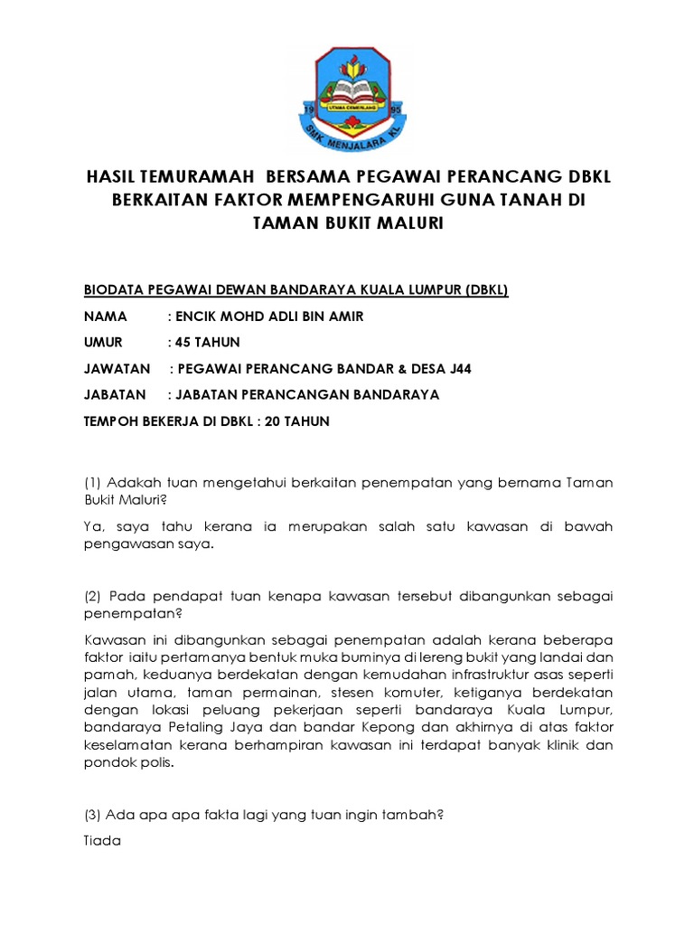 Hasil Temuramah Bersama Pegawai Perancang Dbkl Berkaitan Faktor Mempengaruhi Guna Tanah Di Taman Bukit Maluri