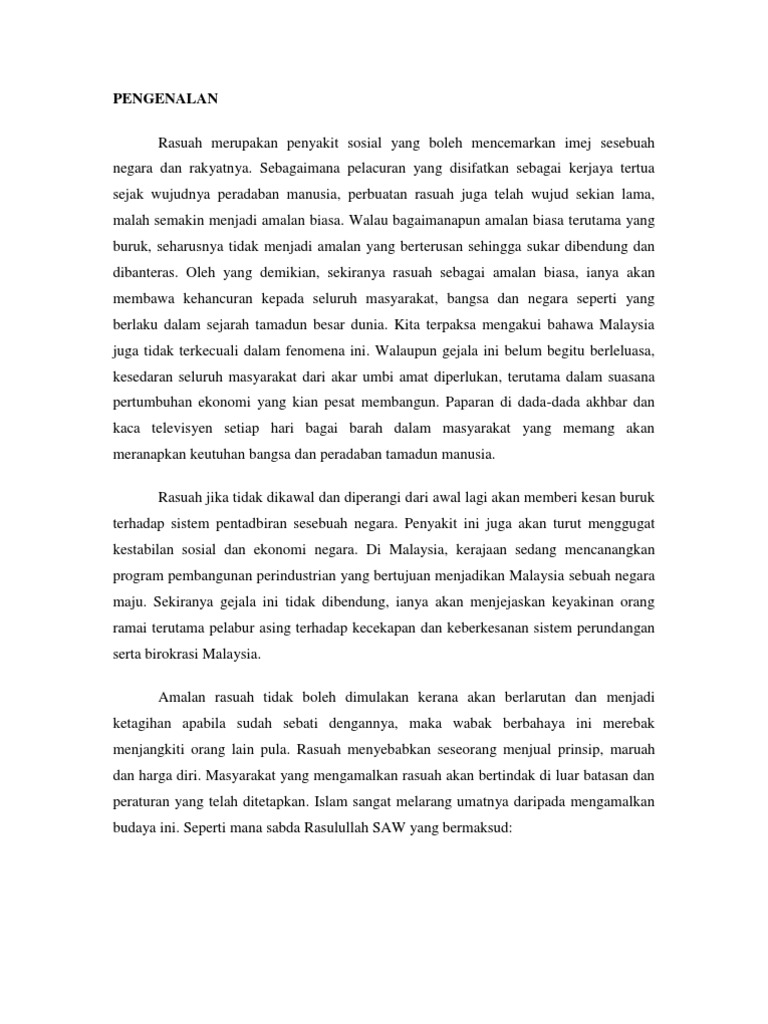 Kesan buruk gejala rasuah kepada masyarakat dan negara. Contoh karangan kegiatan rasuah meninggalkan pelbagai perkara yang negatif kepada masyarakat dan malaysia. Terdapat beberapa faktor dan langkah langkah drastik yang perlu dilakukan untuk mencegah kegiatan rasuah ini. Antara faktor yang menyebabkan gejala rasuah ini adalah kelemahan peribadi seseorang induvidu. Selain itu gejala rasuah yang dilakukan oleh seseorang individu itu boleh merebak kepada orang lain dan keadaan ini pasti akan menggugat keharmonian masyarakat.