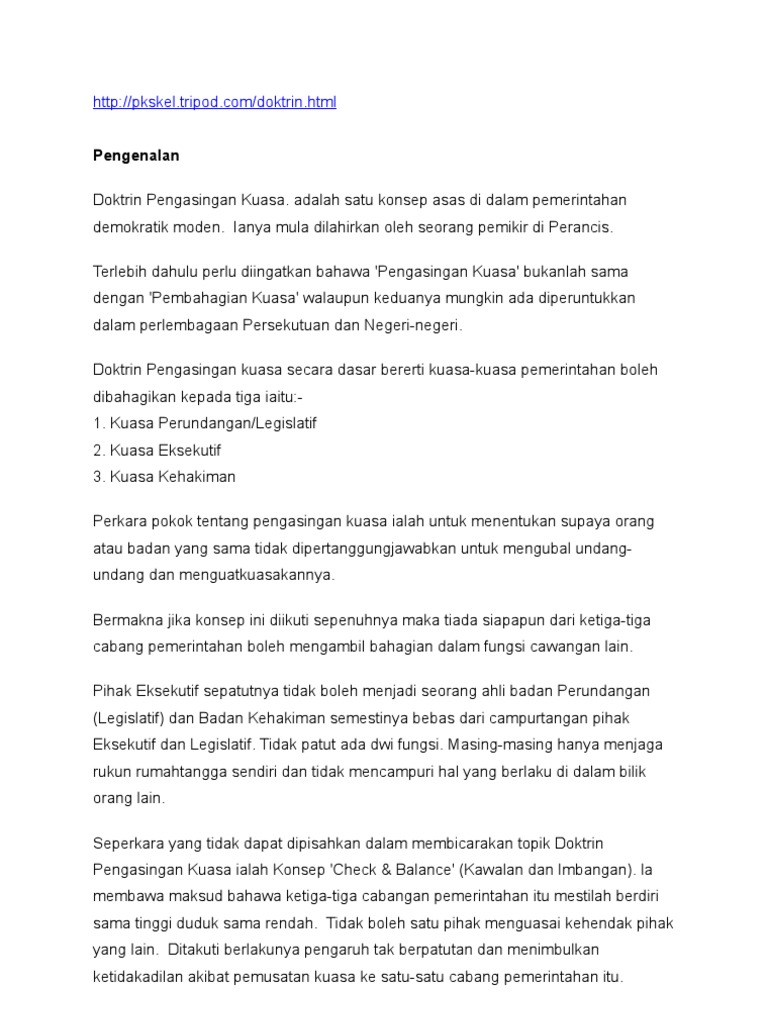 1 doktrin pengasingan kuasa yang diambil oleh malaysia berbeza daripada d oktrin pengasingan kuasa kuasa asal. Arti kata dari doktrin. Kesimpulan kesimpulan nya doktrin pengasingan kuasa ini wajar dan sesuai diamalkan dalam sistem pemerintahan negara malaysia.
