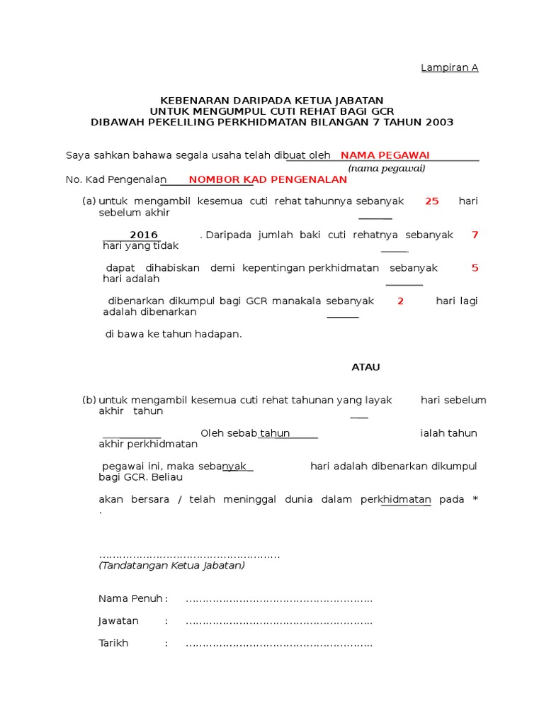 Kebenaran Daripada Ketua Jabatan Untuk Mengumpul Cuti Rehat Bagi Gcr Dibawah Pekeliling Perkhidmatan Bilangan 7 Tahun 2003
