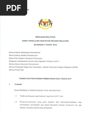 Maklumat pembayaran gaji kakitangan awam 2017. Tarikh dan jadual pembayaran gaji bulanan bagi tahun 2017 yang disertakan ini adalah rasmi berdasarkan rujukan melalui surat pekeliling tarikh dan peraturan pembayaran gaji terkini yang telah dikeluarkan oleh jabatan akauntan negara malaysia janm. Pembayaran gaji awal ini bagi membantu penjawat awam yang berkaitan untuk membuat persiapan. 11 oktober 2017 rabu 11.