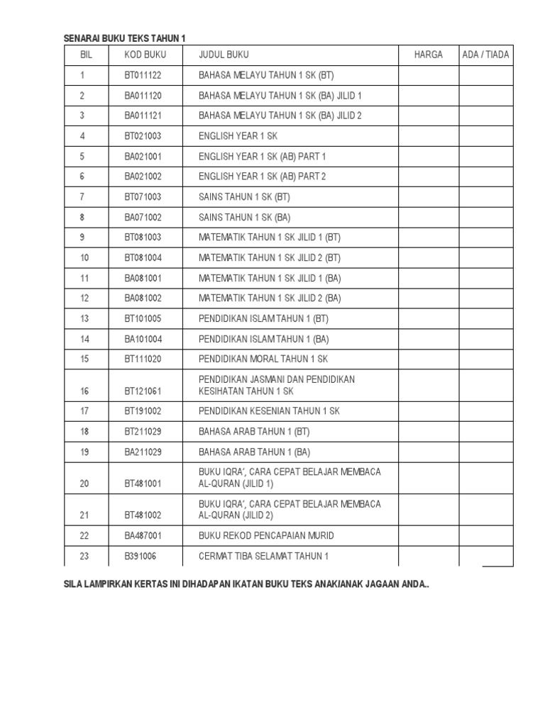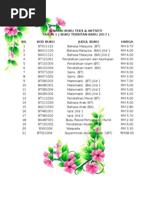 Senarai Buku Teks Aktiviti Tahun 1 Buku Terbitan Baru 2017 Bil Kod Buku Judul Buku Harga