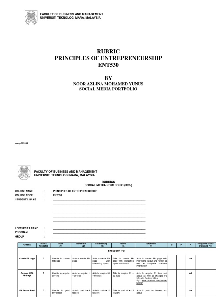 Ent530 Rubric Social Media Portfolio Pdf Faculty Of Business And Management Universiti Teknologi Mara Malaysia Rubric Principles Of Entrepreneurship Course Hero