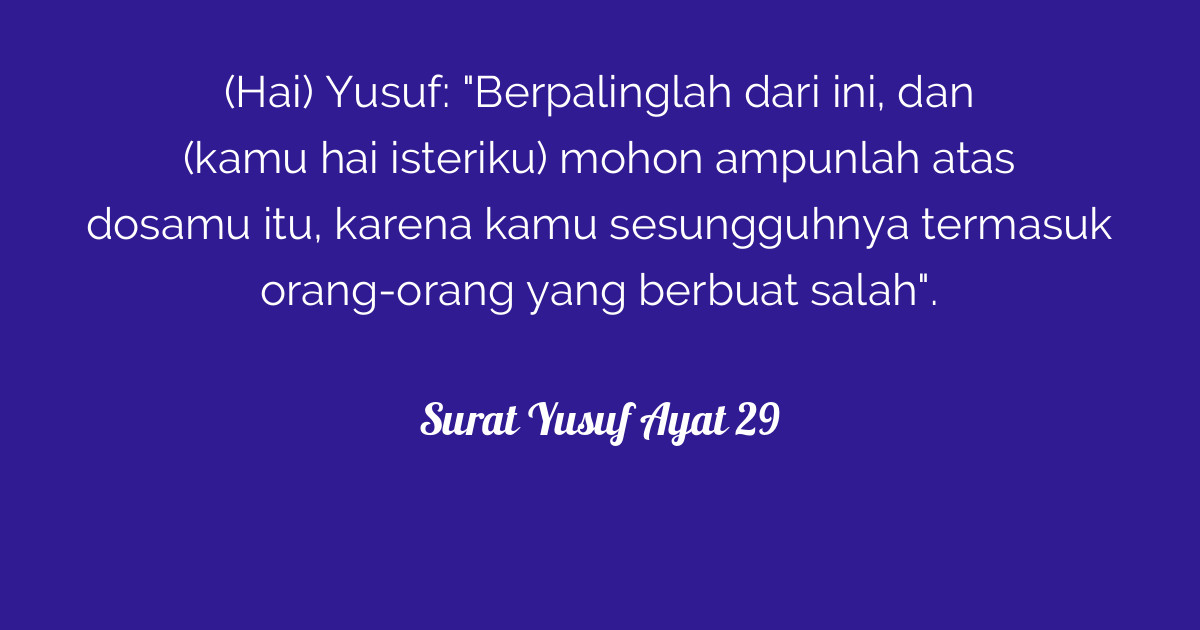 Surah yusuf ayat 29. Tafsir surat yusuf ayat 27 29. Surat yusuf ayat 29 ي وس ف أ ع ر ض ع ن ه ذ ا و اس ت غ ف ر ي ل ذ ن ب ك إ ن ك ك ن ت م ن ال خ اط ئ ين hai yusuf. Setelah al aziz mengetahui bahwa istrinya yang bersalah lalu ia berkata kepada nabi yusuf wahai yusuf. Berpalinglah dari ini dari peristiwa ini lupakanlah supaya jangan tersiar beritanya dan kamu mohon ampunlah hai.