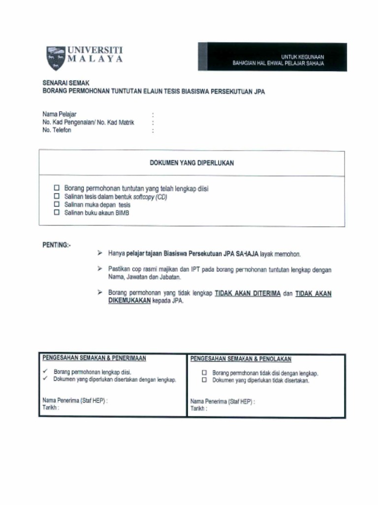 Borang Permohonan Tuntutan Elaun Tesis Biasiswa Persekutuan Jpa