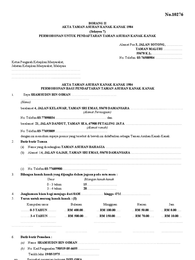 Taman Asuhan Contoh Borang Pendaftaran Taska